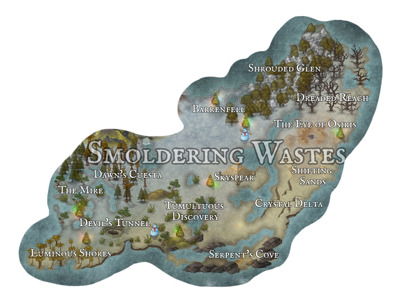 Internal TerritoriesCerulean FallsCoral ShoresDawn's CuestaEndless PlainsPlummeting CliffsPoseidon’s UndergroundReaching PlateausSandstone CanyonShifting DunesSkyspearStoney CoveThe MireVerdant's Grace